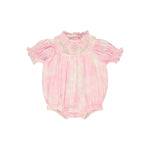 The newest development for the spring/summer season we are so proud to present - gorgeous balloon fit Melody romper in sweetest bubblegum pink. The fabric is hand made tie-dye - each item is special and unique. Lightweight romper features short puff sleeves with a hand made smock and a smock collar with beautiful hand-made flower embroidery. Mother of pearl opening in the back and snaps between legs for easy change.
