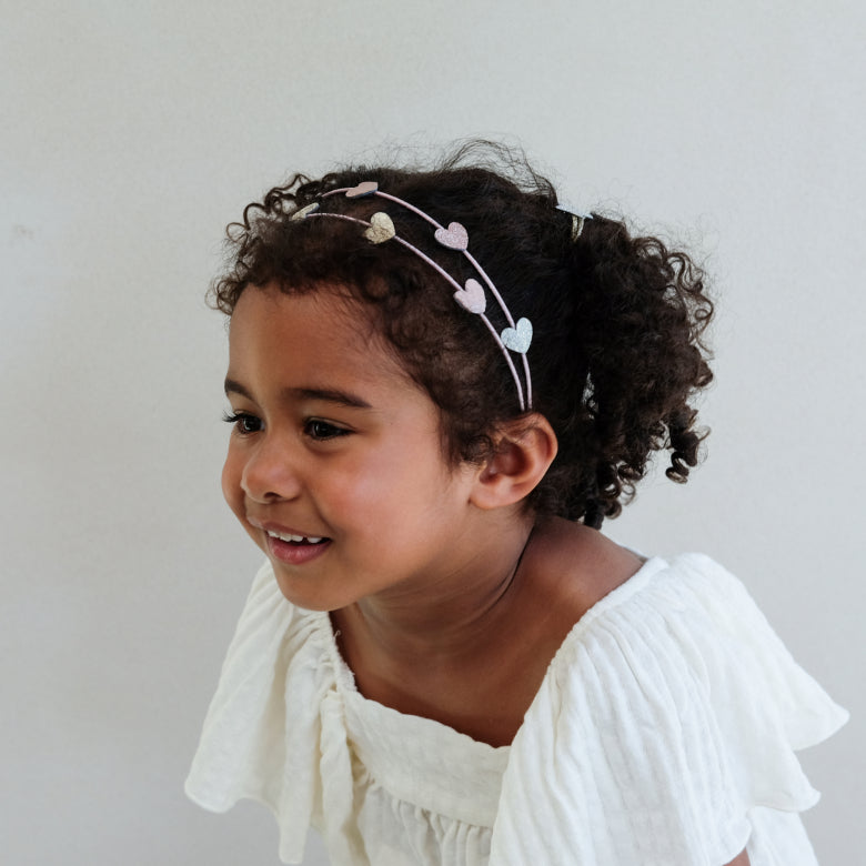 Alice band sized to fit ages 3-10 years Two ribbon-wrapped rows adorned with hearts crafted from soft metallics and beautiful glitter fabrics