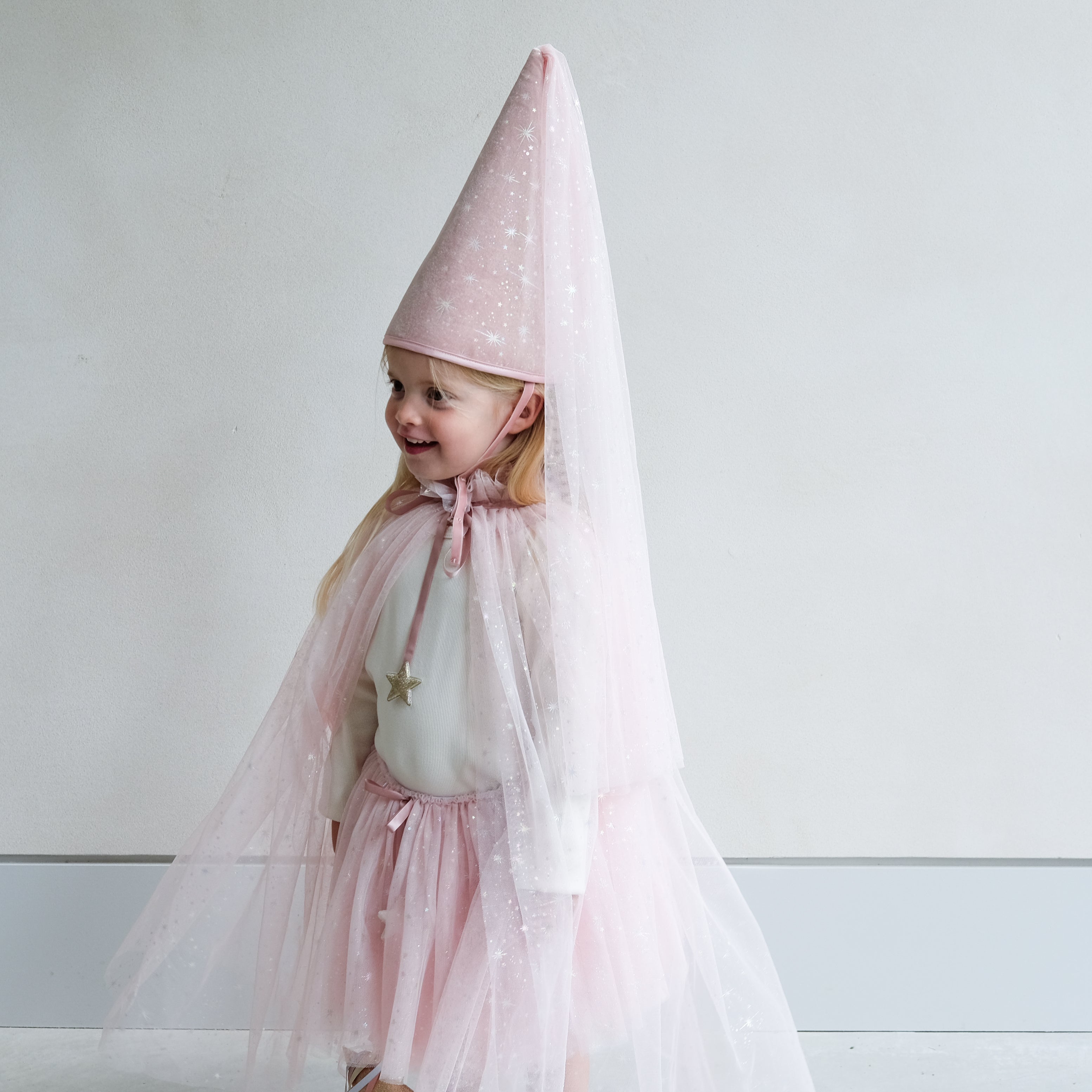Step into a world of enchantment with our Shimmer princess hat! Crafted from the dreamiest soft pink velvet scattered with twinkling stars - why not pair with our matching tutu or cape for a really royal transformation!