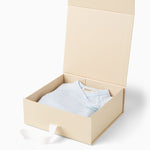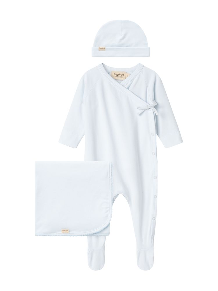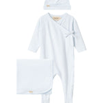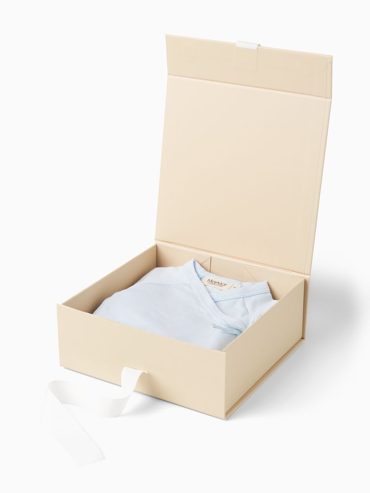 Gift box containing a newborn set consisting of a jumpsuit, hat and baby blanket.