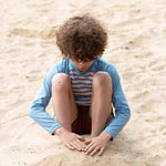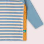 Splash into summer with our recycled swimwear! This long sleeve pull-on rash vest is soft and stretchy with flat seams for extra comfort, plus has UPF 50+ sun protection to keep them safe in the sunshine. Pair with our swim nappies, swimsuit or swim shorts and jump in! Extra Details: - 87% Recycled Nylon 13% Spandex - Made from recycled materials! - Sunsafe UPF 50+ sun protection, plus long-sleeves & high neck for extra skin coverage - Soft & stretchy material with flat seams for extra comfort - Unisex, easy-to-spot prints with a gold seam panel for visibility - Oeko-tex certified fabric To keep swimwear in tip top condition: Always rinse out with fresh water after use to protect colour & fabric shape Machine wash at 30 degrees Do not iron Do not tumble dry Do not bleach Do not dry clean Wash with similar colours Wash inside out Max shrinkage 5% Warning: UPF 50+ sun protection only protect covered areas & should not replace suncream.