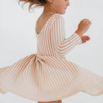 Our signature Good Apples dress is made from stretchy-soft organic cotton and designed with a ballet-inspired silhouette. It features a fitted bodice and sleeves, a graceful scooped back, pockets for all their treasures, and a full circle skirt for endless twirling. 95% organic cotton and 5% spandex. Machine wash cold with like colors. Tumble dry low. View Our Size Guide