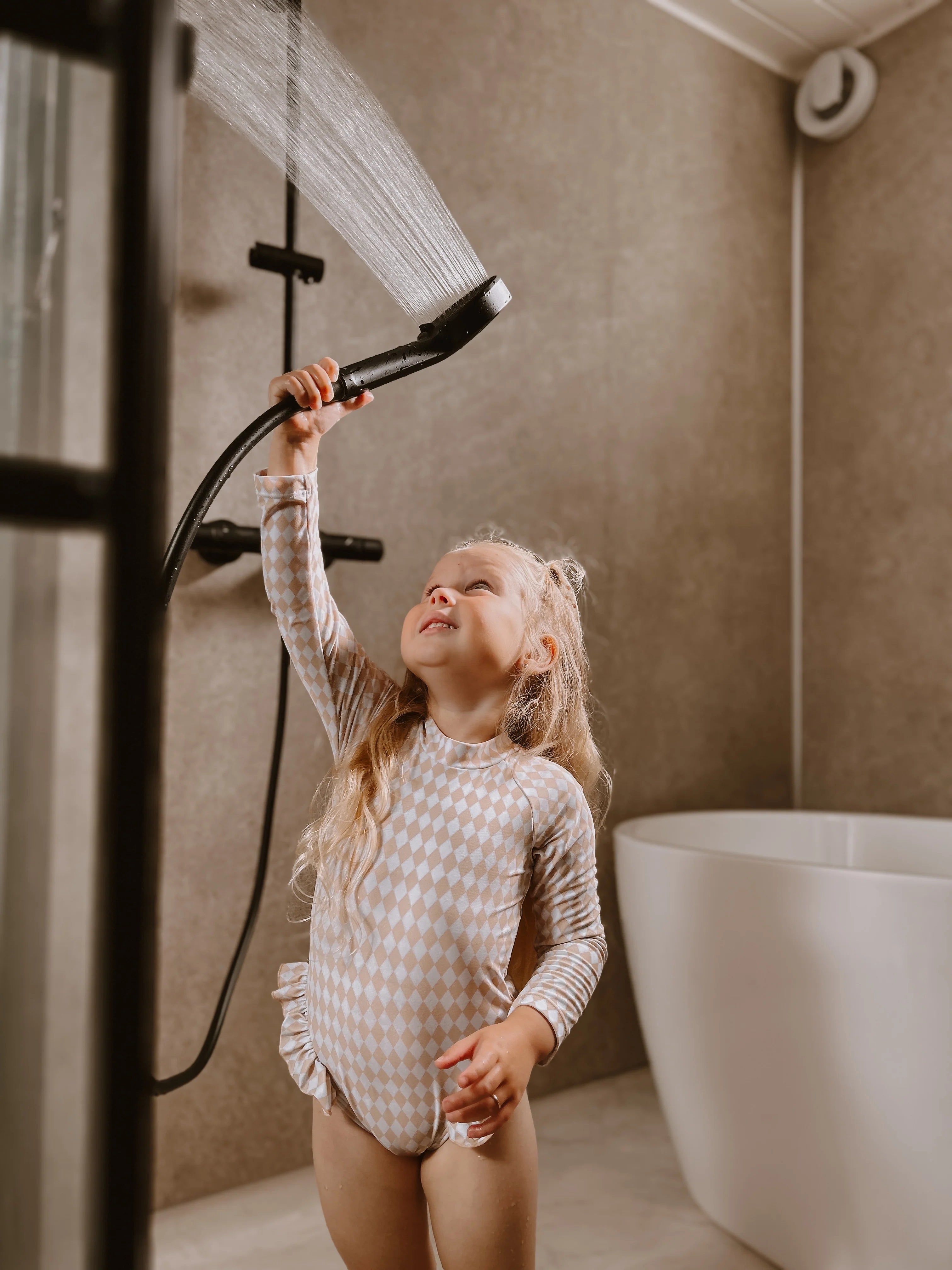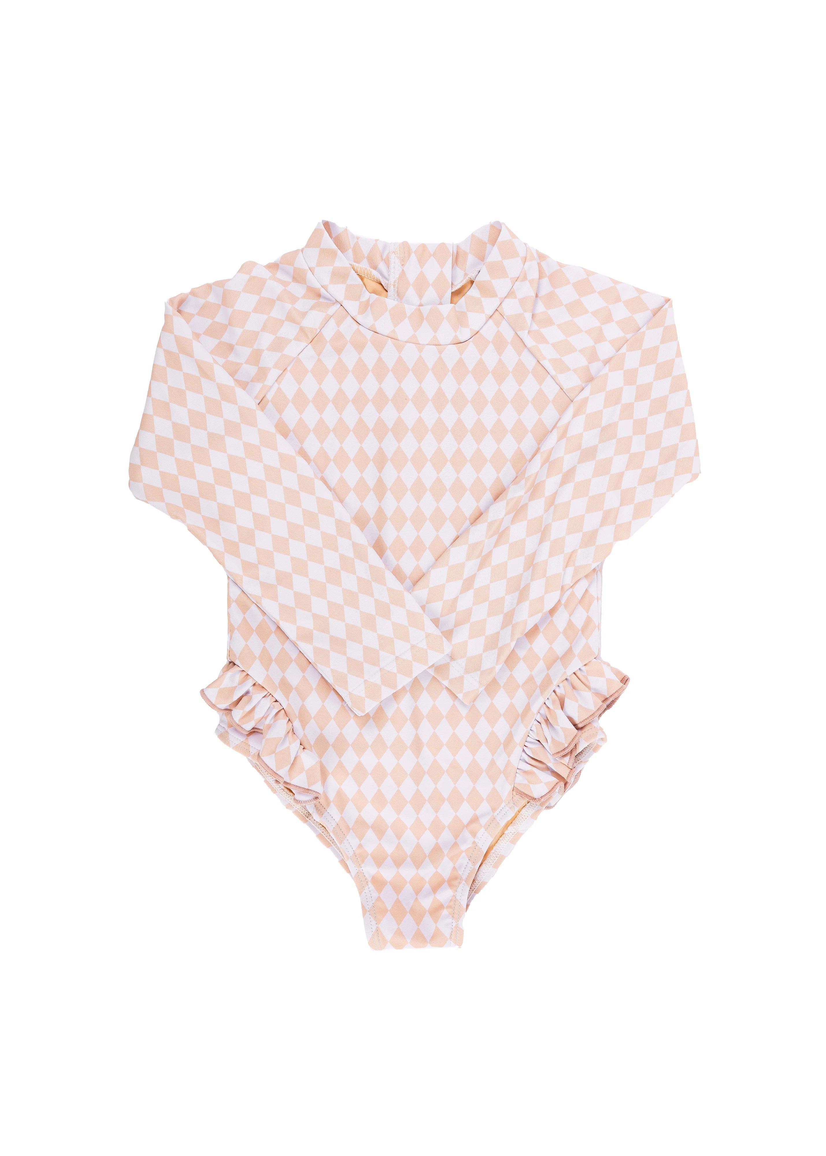 The Ariella swimsuit, a best-selling model with a long sleeve for added protection, is this season's most stylish. Perfect for your kids to wear this summer, with neutral tones and unique, irresistible patterns!