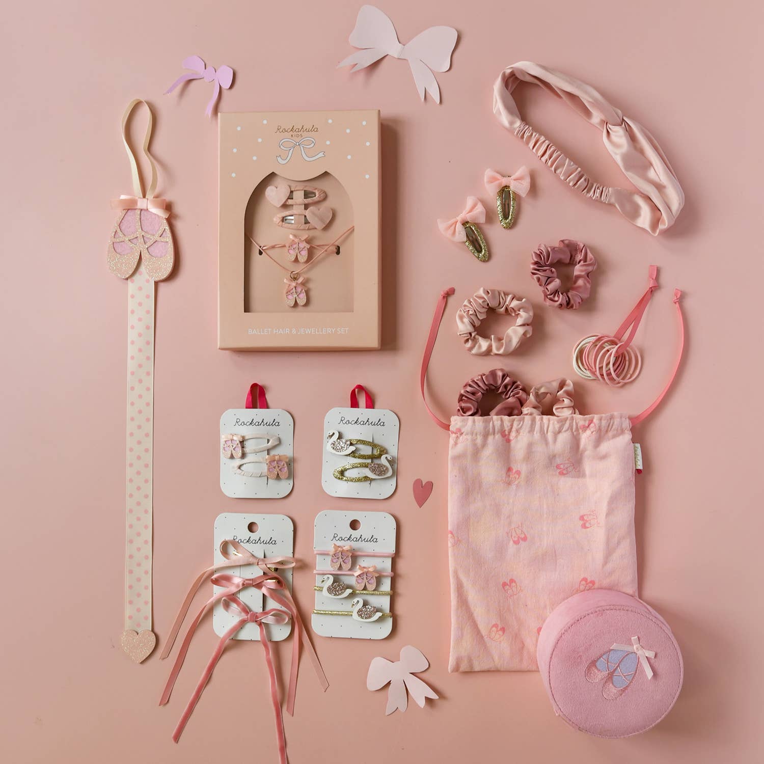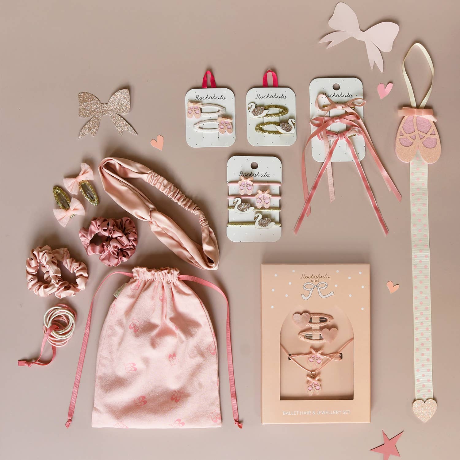Two pretty little ballet slippers in soft pink glitter, with a beautiful little pink bow. Each is secured onto a pastel pink ribbon wrapped snap clip. Perfect for pirouetting your way through the season! Not suitable for children under 36 months due to small parts. Style code: H1800P