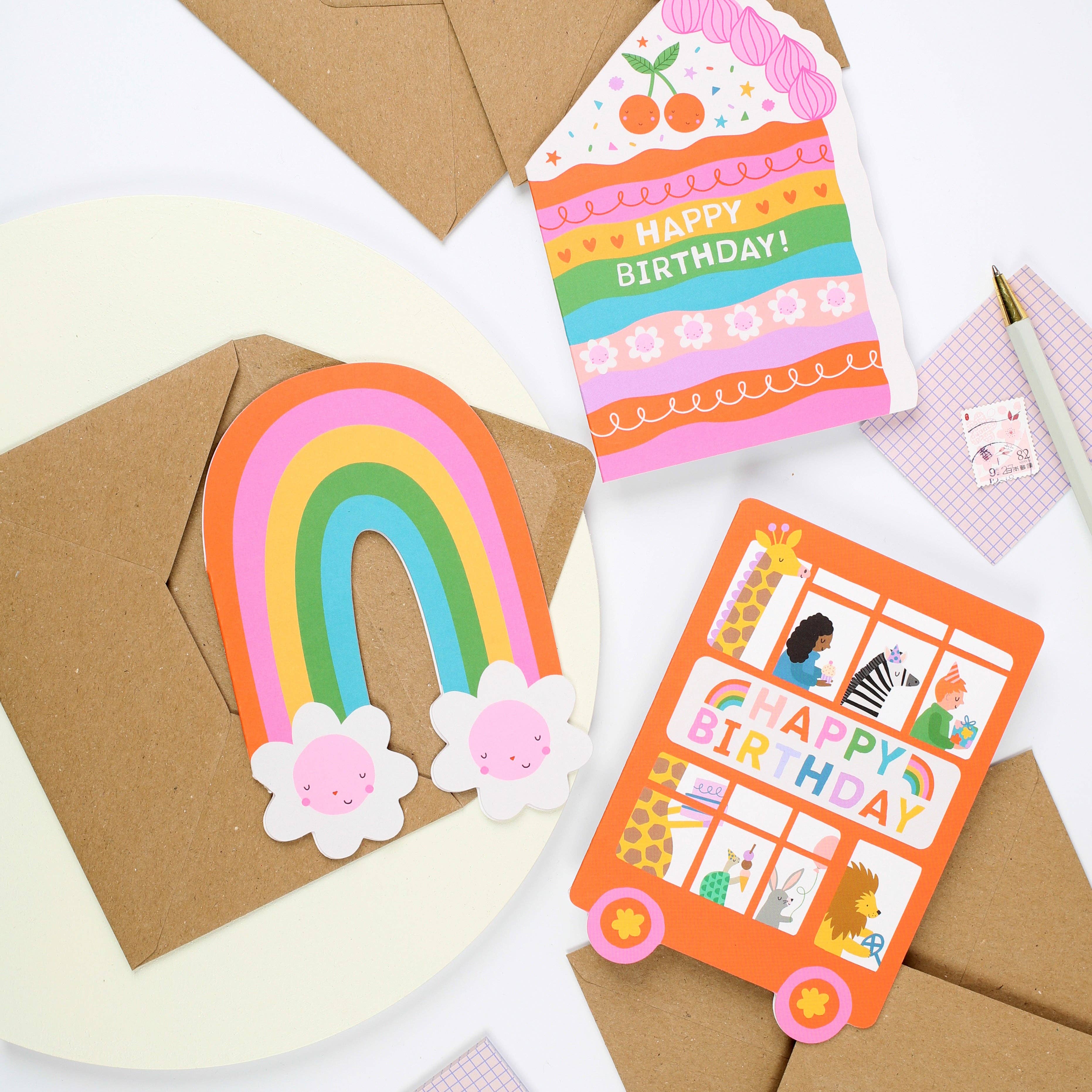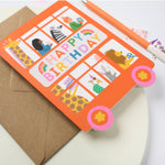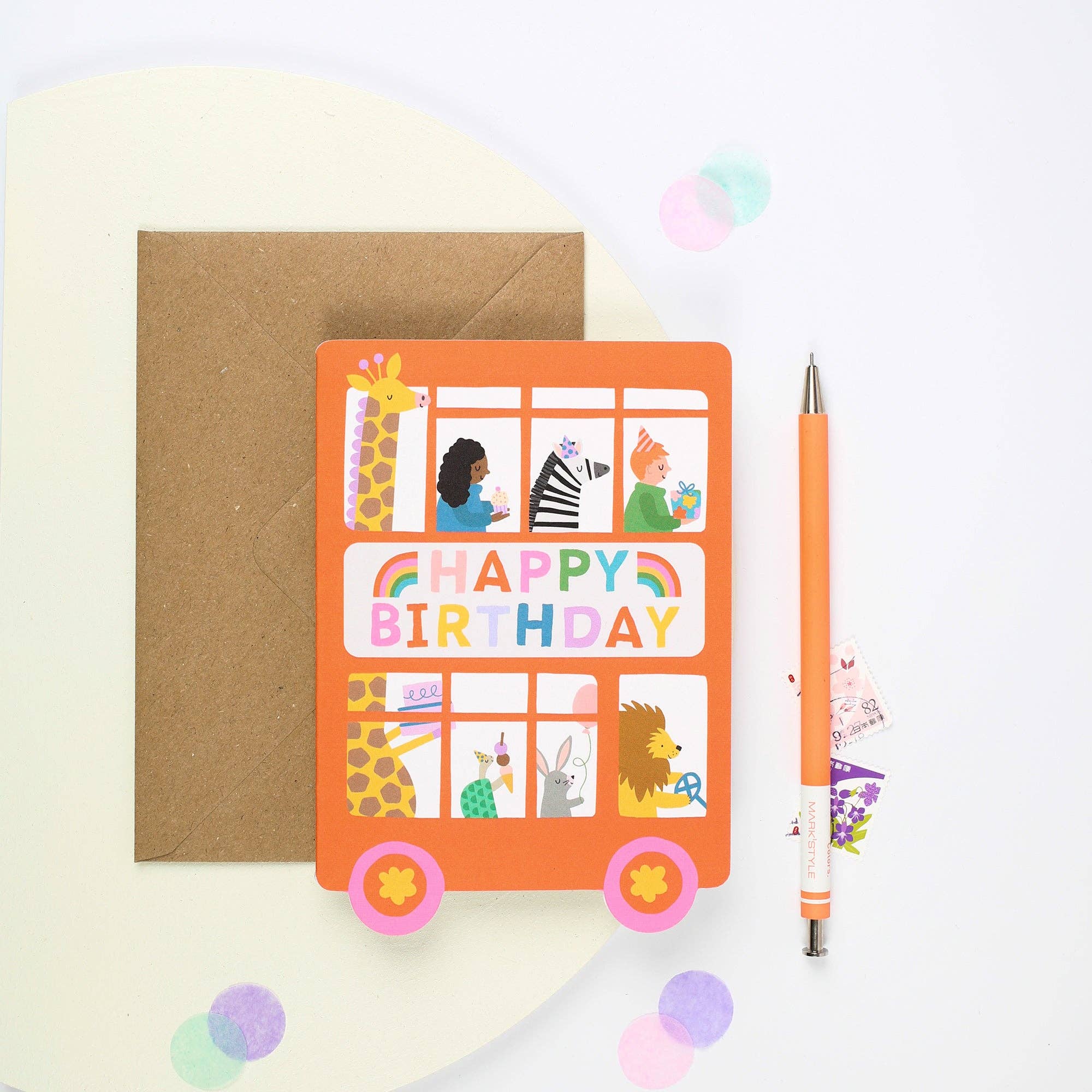 Celebrate a child’s birthday with a touch of whimsy and adventure using our die-cut double decker bus birthday card! This delightful and unique card is expertly shaped like a double decker bus, featuring a colourful illustration that’s sure to captivate and entertain. The card showcases a charming scene with kids, a giraffe, a zebra, a bunny, and a tortoise, all joyfully riding along as they’re driven by a friendly lion. This engaging design adds a fun and imaginative twist to any birthday celebration, making it the perfect choice for those who love a bit of playful magic. Crafted with luxury and care in the UK, this high-quality card stands out for its creative design, ideal for celebrating your loved one’s special day in a fresh and exciting way, this die-cut bus card is sure to bring smiles and joy to all who receive it. Made in the UK Die cut shaped card Size: 105mm x 150mm Uncoated premium 300gsm, responsibly sourced card Paired with a recycled kraft envelope Blank inside Supplied without cello pack