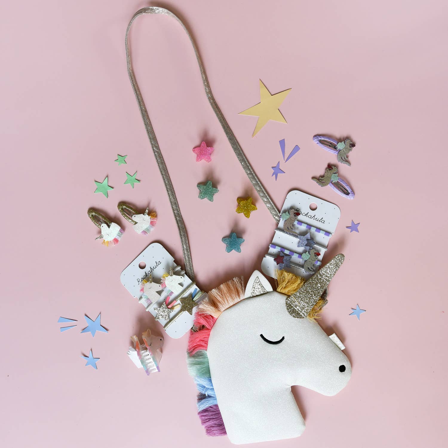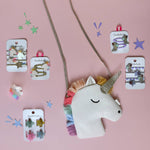 We believe in unicorns, and so can you! Our rainbow unicorn bag is made from super soft white glitter with a brightly coloured rainbow mane and a glittery gold horn. This bag features a magnetic dot closure, gold starry lining and an adjustable gold strap with a break point for safety. Bag dimensions: 19cm x 19.5cm. Actual storage space: 10.5cm deep. Strap drop length: 48.5cm. Matching hair accessories, wand, clip hanger, knitwear and earmuffs also available. Made using recycled fabric and glitter. Not suitable for children under 36 months due to small parts. Style code: G2202W