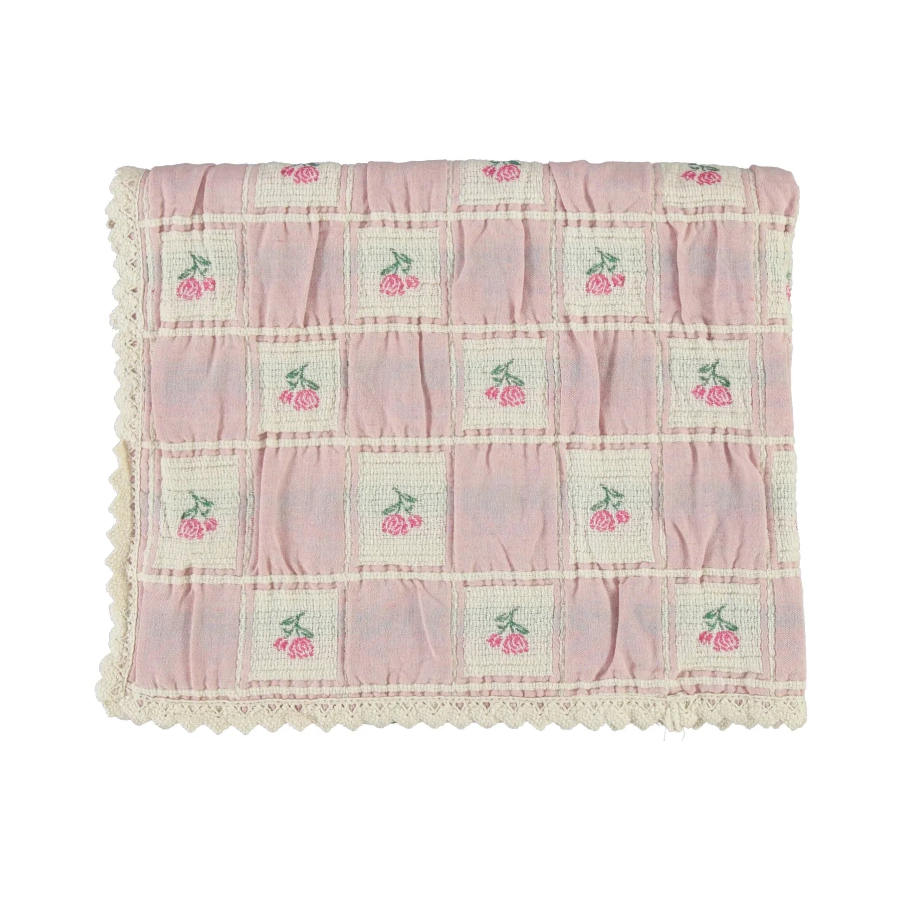 This charming patchwork blanket features a vintage-inspired rose jacquard and is delicately finished with cotton lace edging—crafted from the finest 100% organic cotton for a luxuriously soft touch. Thoughtfully designed to be gentle on sensitive skin, it's perfectly sized to wrap your newborn in comfort and warmth, while still cozy enough for growing little ones. A beautiful and timeless gift for any occasion.