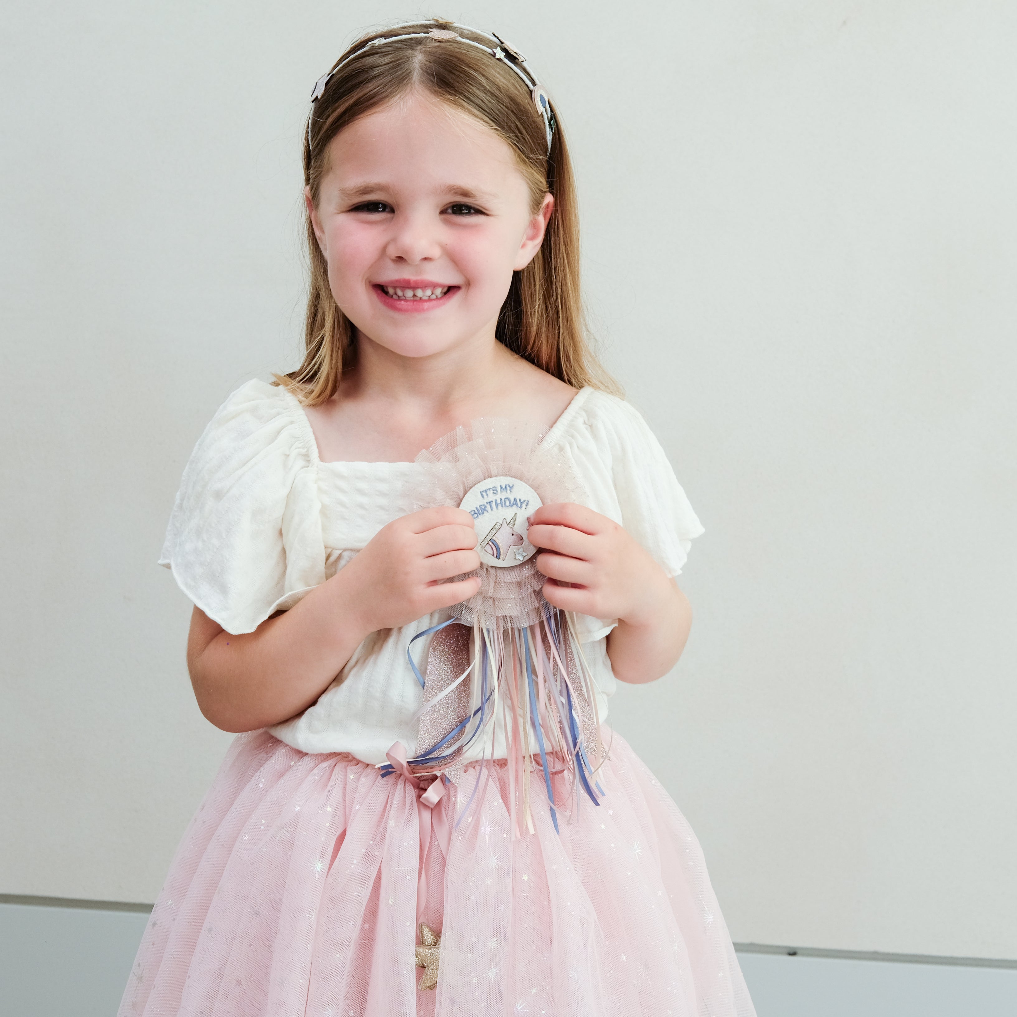 Help them celebrate in style year after year with our magical new unicorn birthday badge! Featuring layers of soft, glitter-speckled tulle and a colourful trail of ribbons, it’s the perfect sparkly touch for any birthday star!
